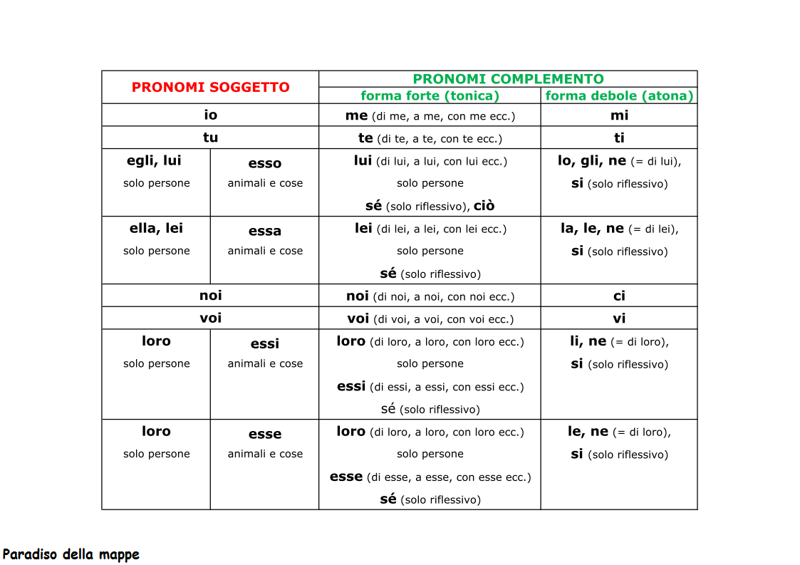 Tabella con Pronomi Soggetto e Pronomi Complemento